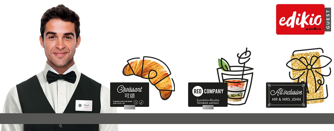 Ein Mangel an Informationen oder Ästhetik am Buffet kann dem Image eines Hotels schaden. Das Buffet zu verschönern und den Informationsbedarf einer anspruchsvollen Kundschaft zu decken, wird nun leicht möglich. Mit Edikio Guest kann der Restaurantleiter Präsentationsetiketten auf robusten, abwaschbaren Karten erstellen. Diese ermöglichen es, alle notwendigen Informationen wie Bezeichnung, Zutaten oder Allergene in einer oder mehreren Sprachen anzuzeigen. Diese innovative und flexible Lösung wird den Gästen helfen, schnelle und informierte Entscheidungen zu treffen und den Andrang am Buffet flüssiger zu gestalten.
